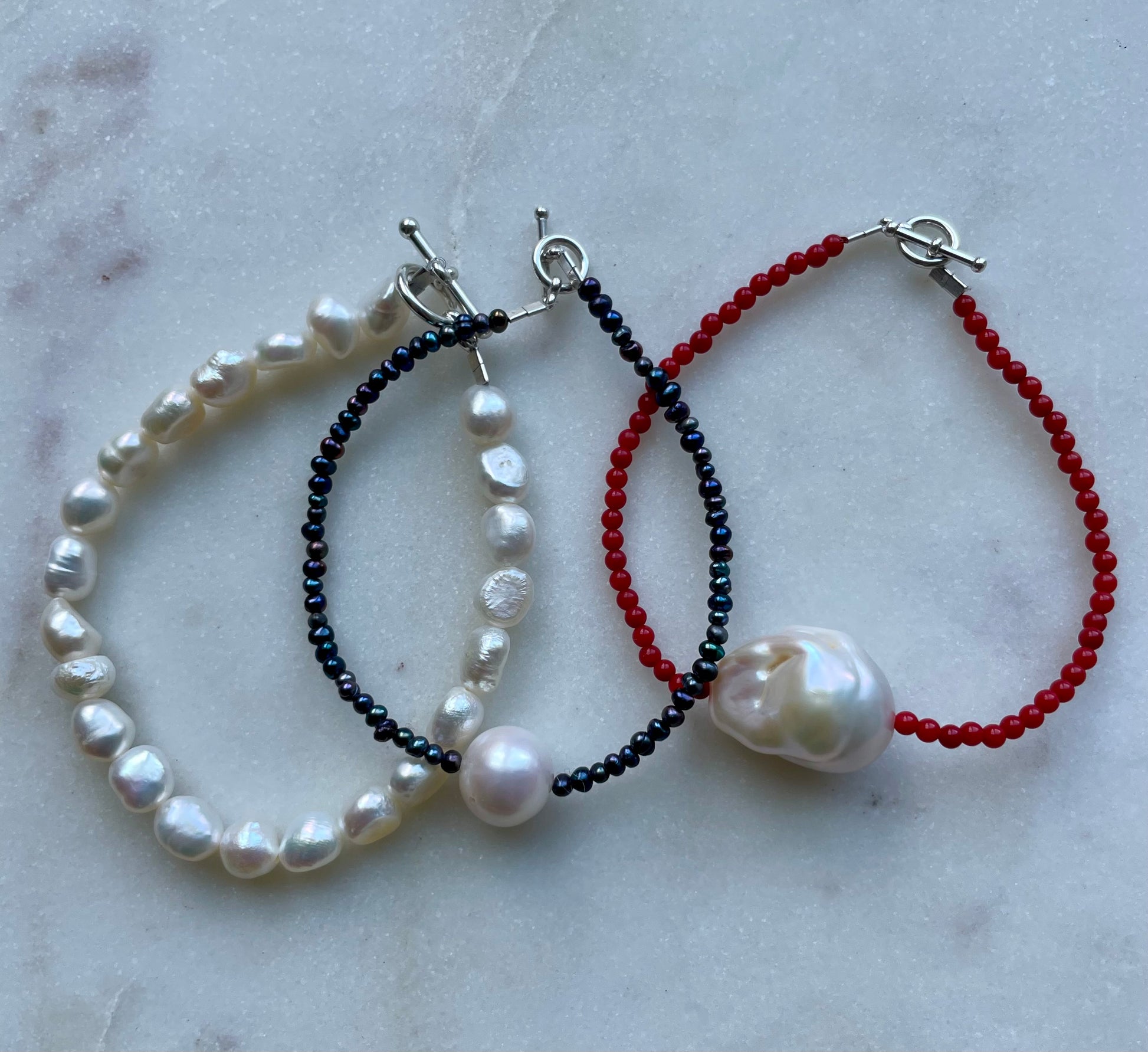 A little bit of red on your left wrist never hurt anybody! Show stopper flame ball pearl (20mm) on naturally dyed red coral beads (2-3mm). Closed with sterling silver toggle ball end. Please review all the pictures for stacking ideas and choose your size below. This design also comes as a necklace - find it in the necklaces category.