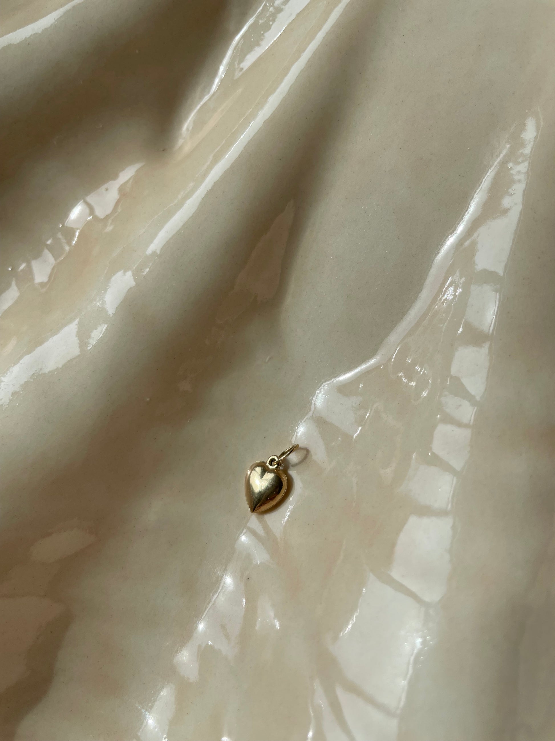 Tiny token of love. Made out of 14k yellow gold, diameters are 13.8 mm x 7.8 mm. The puffiness is cute and real. Wear on your favorite chain or add it to your favorite Arauz Jewelry necklace.